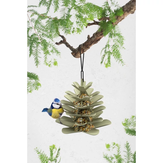 - Dekoratív toboz formájú szemes takarmány adagolására alkalmas madáretető